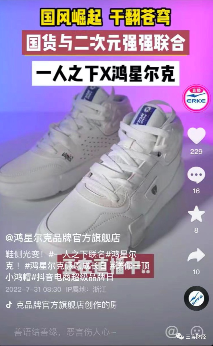 再比如这款鸿星尔克与二次元联合推出的“一人之下”。