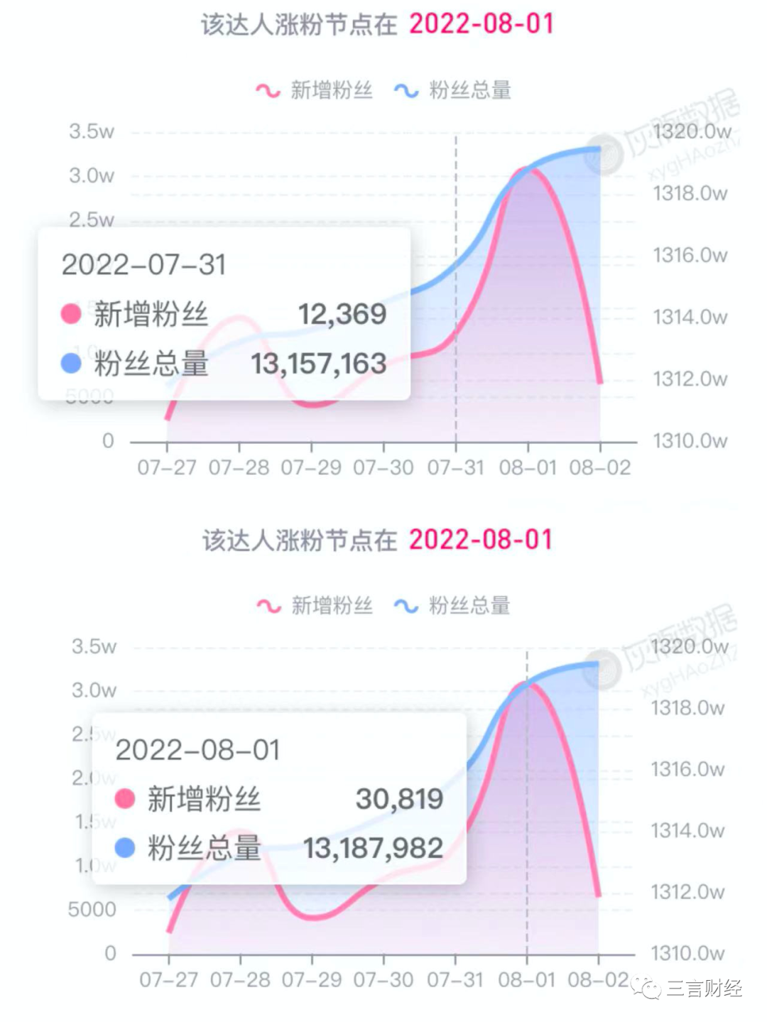 据第三方数据平台显示,鸿星尔克品牌官方旗舰店的抖音账号在7月31-8月1日,迎来一波粉丝增长。7月31日新增粉丝12369,8月1日新增粉丝30819。