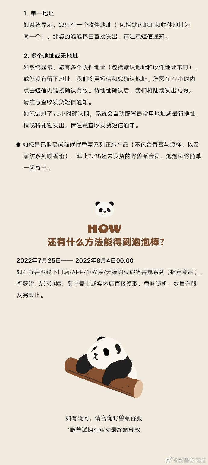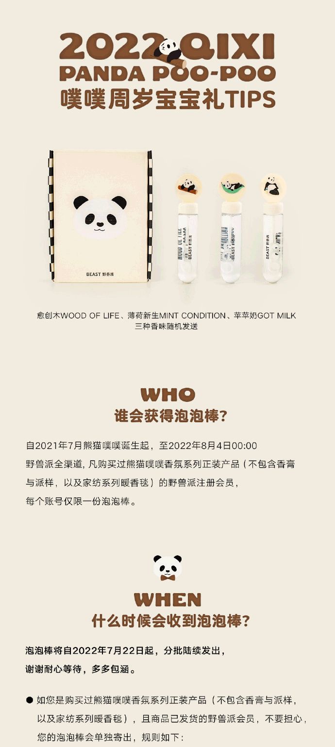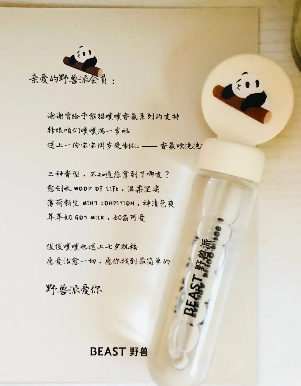 野兽派无疑就想充当这个引导者的角色。正值七夕也恰好是噗噗满一周年的日子,野兽派以噗噗和龚俊作为献礼的发声者,赋予品牌人格化的角色,推出一场限定会员礼的活动,为全渠道购买过熊猫噗噗香氛系列的会员,赠送一份泡泡棒。