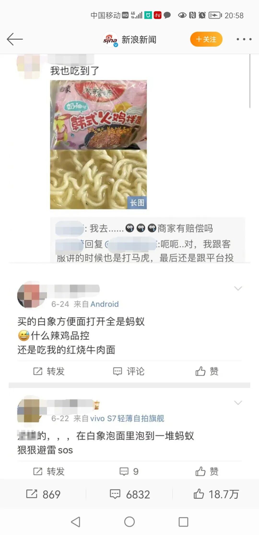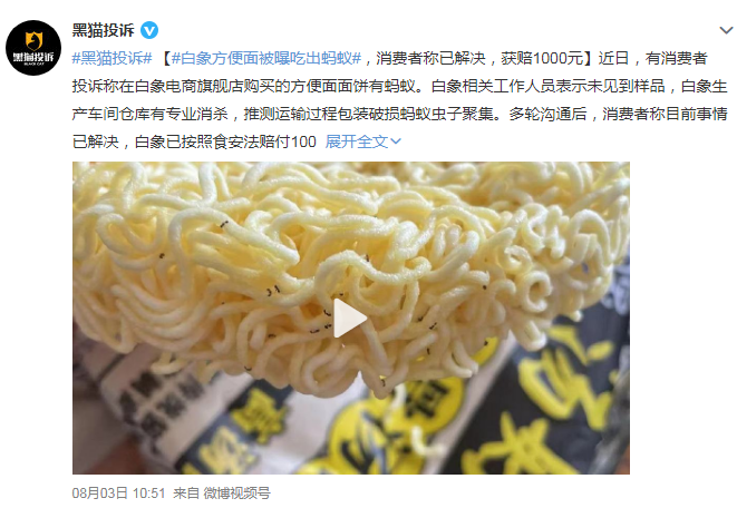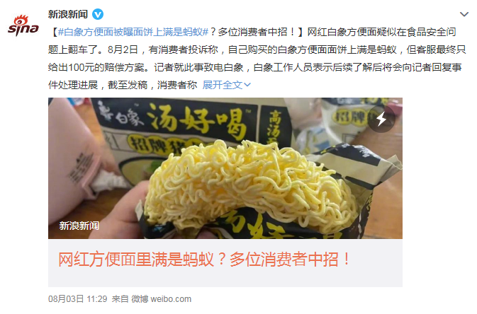 昨天,就在全网谴责佩洛西之时,一条#白象方便面被曝面饼上满是蚂蚁#的热搜令许多人震惊不已。事情的起因是某媒体接到消费者李女士的投诉,称自己 7 月 26 日在京东超市购买了白象汤好喝招牌猪骨汤面,7 月 29 日煮面时发现面饼上满是蚂蚁。随即事件在网络发酵,更多消费者爆料自己购买的白象方便面惊现蚂蚁。但意外的是,事件似乎并没有走向一般意义上的负面舆论。同为国货之光的鸿星尔克刚因捐款1亿再次引发野性消费,白象的蚂蚁事件就引发全网热议。其实事件在闹到网上之前,该消费者与白象官方进行了多轮沟通。李女士在发现蚂蚁之后随即就拍照留存,然后拨打了白象客服电话。不过该客服在辨认之后称无法辨认来源于产品本身,判定为受到外部虫害浸染了。表示白象工厂有专业的消杀公司服务,车间不存在蚂蚁。并提出作为感谢,赔偿购买价格 2 倍的补偿。但李女士难以接受,并坚决否认自己作假P图。虽然事件陷入了罗生门,但最终白象与其还是达成赔偿协议,按照《食品安全法》赔偿了 1000 元。但事件结束,舆论并未平息,网络上出现大量消费者爆料自己的相关情况。涉及产品包括白象辣牛肉面、白象韩式火鸡面等,且这些消费者的投诉都未得到合理解决。大多数网友无条件相信白象,表示肯定不是生产线上的问题。有人“阴谋论”。台湾一出事白象就有麻烦你说巧不巧。把矛头直指统一和康师傅在背后出阴招。有人国货之光滤镜浓厚。表示默认跟雪莲一样,就是有蚂蚁也吃。表示蚂蚁又无毒,高蛋白,挺好吃的其实。更科普起了冷知识,人类一辈子,在睡梦中要吃下大约250只虫子,只是你不知道罢了。甚至有网友调侃,失望透顶,我的为啥没放蚂蚁,缺斤少两!请速速给我寄蚂蚁。当然也有理智粉表示,不会因为白象方便面被爆出有蚂蚁而不再买它,不过也希望白象能重视此事,毕竟食品安全大于天!还有热心网友提出建议,制作时多一道工序,把面饼用袋子先密封一层,这样消费者打开外面的包装袋有问题的话,就能发现是否是生产的时候翻了车。这样的情景,让我想到前段时间大小布丁抽检不合格之时全网力挺的盛况。阴谋论也好,滤镜也罢。消费者如此反常的表现其实更多是对整个行业头部品牌的不满,从而转嫁到一个在过往始终给大众带来好感的品牌身上。虽然白象得到了网友的力挺,但在8月4日凌晨1点,白象还是发布一则态度十分强硬的声明。声明中,白象言之凿凿表示,经核查,此事绝非本公司生产过程中出现的品质问题。更表示对于捏造事实、误导公众的行为将采取法律手段维权。为了自证清白,白象还在工厂进行了一场近16小时的直播生产,揭秘一碗面的诞生过程。但即便如此,面对一包已经打开的方便面,除了那位消费者自己,恐怕我们不可能还原事实真相了。只能通过合理推断来去反推蚂蚁进到方便面里面的可能性。其实只要稍微了解一下方便面的工业生产流程,其实就知道它发生的概率无限趋近于0。先说车间环境。不要说白象,任何一家正规的方便面企业生产车间都会经过严格消杀,可以说不存在适合蚂蚁的生存环境,更别说蚂蚁群爬上去。再说生产工艺流程,分为投料-混合-醒发-压延-切丝-蒸煮-切断-油炸-风冷-包装-装箱-入库,在整个过程中几乎没有人工参与的环节。尤其是经过切丝、蒸煮、油炸、风冷环节,不可能出现一只只完整的蚂蚁附着在面饼表面。而这也正是白象敢信誓旦旦排除生产过程出问题的原因所在。推测大概率是因为包装破损,在仓库或是运输等环节,蚂蚁爬进了包装袋里。但无论如何,我们也只能得到这个理论上的真相,事实上的真相注定不得而知了。但好在消费者和网友们给予了足够的信任,让白象惊险躲过了这次塌房危机!在互联网舆情时代,我们见惯了“墙倒众人推”的品牌崩塌路数,毕竟大众确实十分乐于看见一个高高在上的品牌幻灭,却少见一个品牌因为“产品质量”问题而获得全网维护。恰恰白象从来不是一个“高高在上”的品牌,相反,它如同我们每一个普通人一样,隐忍、踏实、默默无闻。在当今的品牌界,我们也见惯了靠炒作爆红的傲慢品牌,却少见像白象一样低调踏实的非一线品牌。从这个层面来说,大众某种程度上与白象形成了身份上的共情,所以才会在负面舆论爆发之后有如此大的宽容度。甚至它的走红都充满了意外成分。作为残奥会食品供应商,白象旗下有1/3员工皆为残疾人成为它爆红的起点。“315”晚会之后,康师傅和统一因为酸菜事件纷纷跌落神坛,白象的“独善其身”再次赢得了尊重和信服。随即,它拒绝日资的往事更坐实了“国货之光”的美名。某种程度上来看,白象走红的核心原因其实和鸿星尔克一样,在这个浮躁的时代,人们很难想象一个消失在公众视野多年的品牌会如此有社会担当,它们日复一日坚持做正确的事,才换来如今的高光时刻。而这些通通都成为白象虽深处舆论漩涡,却能全身而退的关键。在我看来,网友如此维护白象的另一个重要原因是,这几天台湾局势的紧张,让统一、康师傅的台湾企业身份稍显敏感。恰逢如此敏感的时间节点,难免把网友引入“阴谋论”的漩涡。对台湾当局的不满,使得网友再次找到了上次在酸菜事件中完胜统一、康师傅的白象。某种程度上来说,力挺白象,也是一种借“国货之光”表达的爱国情怀!