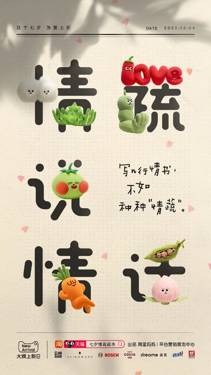 兴许是送鲜花这种常规操作大家已经见怪不怪了,随着今年蔬菜变成硬通货,天猫也紧跟时事联手七大品牌打造了七款「情蔬」毛绒玩偶和一个隐藏款「壁咚瓜」,为配合营销造势,还有一支谐音梗拉满的宣传片,这波「写n行情书」不如「种种情蔬」的操作算得上是七夕脑洞天花板了。