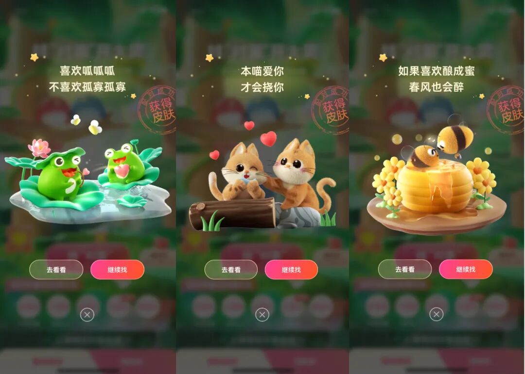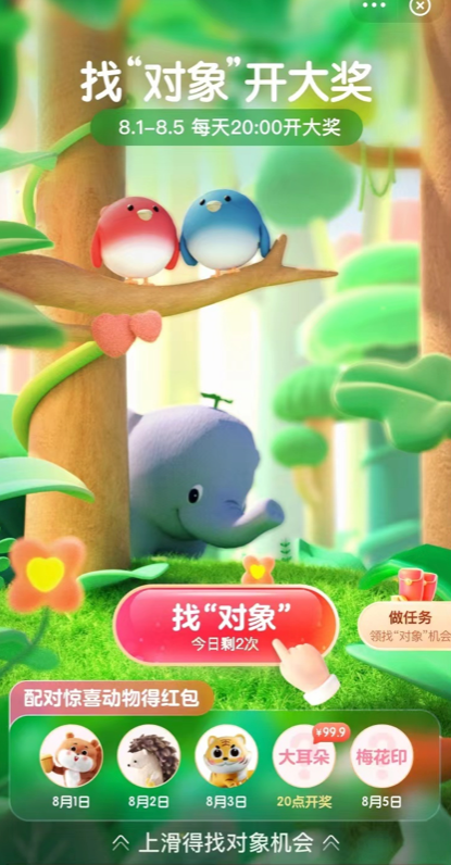 临近七夕,支付宝为用户们牵起了红线,只要在搜索框内搜索「找对象」就可以参与,活动形式类似「集五福」,集齐两个同款动物卡片即可获得对应支付皮肤。