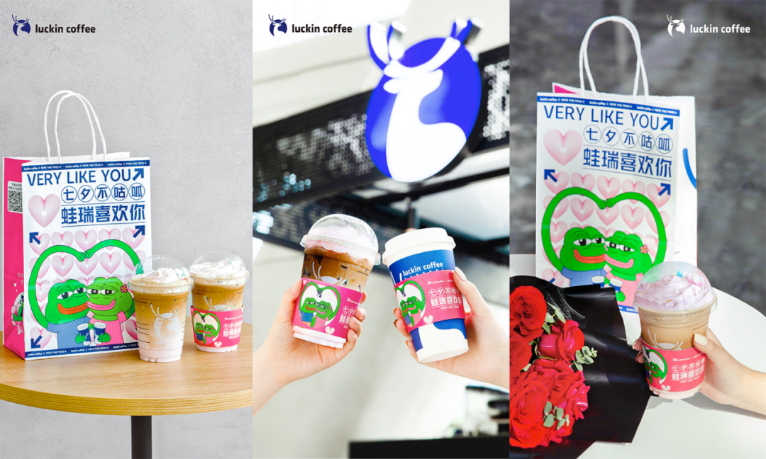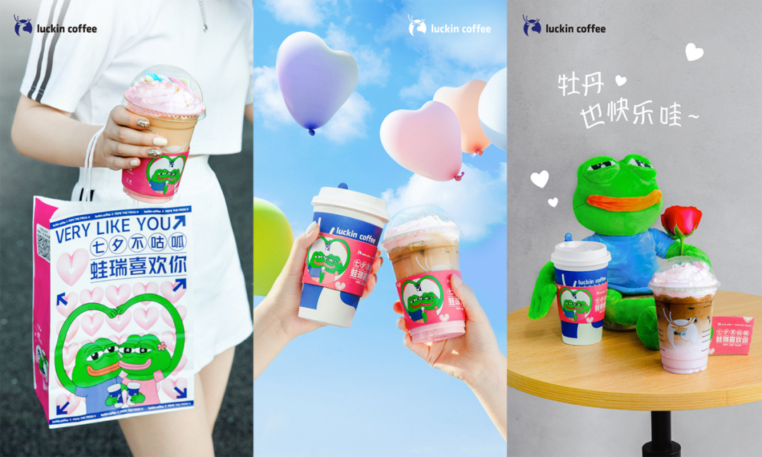 把七夕过成“绿色”的恐怕只有瑞幸了。今年七夕,瑞幸和「咕呱」代表悲伤蛙 PEPE 联名,带来新款饮品和周边杯套纸袋。包装上的悲伤蛙不再是「孤寡」的形象反而是与女友翠花秀起了恩爱。路边的单身狗表示:我没有惹你们任何人。
