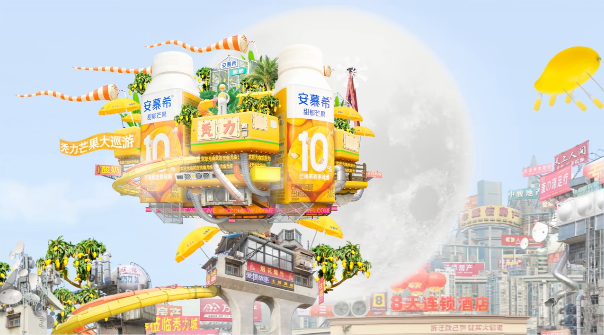 在秃力城的上空,有一个在云中游曳的芒果庄园,岛屿由安慕希“芒果燕麦酸奶”提供动力,城主秃力富化身“芒果大使”,乘坐香甜多汁的芒果园飞行岛完成巡城游行。