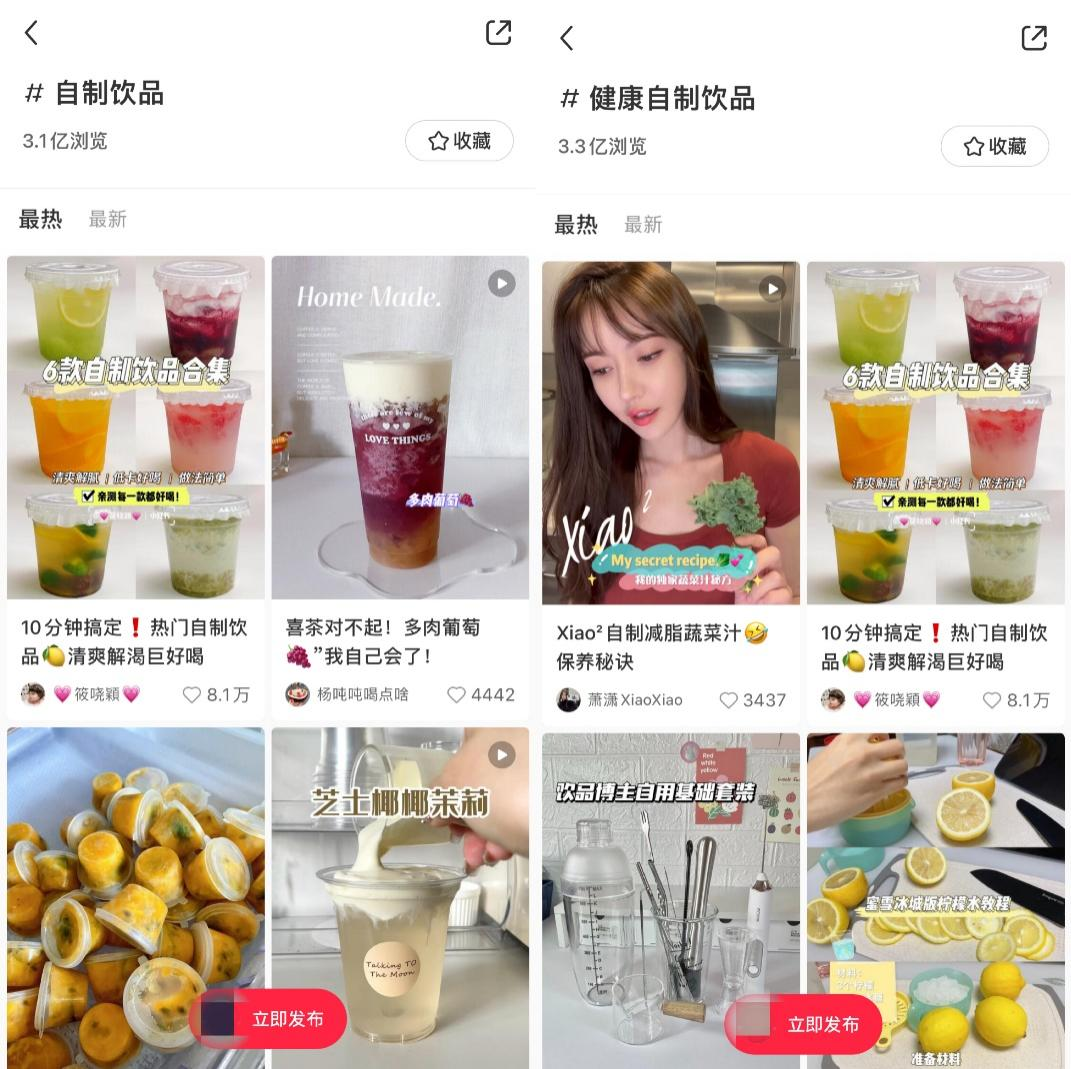 锌刻度发现,在小红书上,“自制饮品”话题浏览量达到3.1亿次、“健康自制饮品”话题浏览量达到3.3亿次、“自制神仙饮品”话题浏览量达到3亿次;在微博上,“自制饮品”话题有10.1万讨论量、1.4亿阅读量;在抖音上,“自制饮品”相关视频播放量达到177.8亿次、“饮品制作”相关视频播放量达到15亿次。眼下,并不需要太多技术含量的自制饮品俨然已经成为了流量密码,简单的几张图文分享,或者15秒的制作视频就能够轻松收获关注。