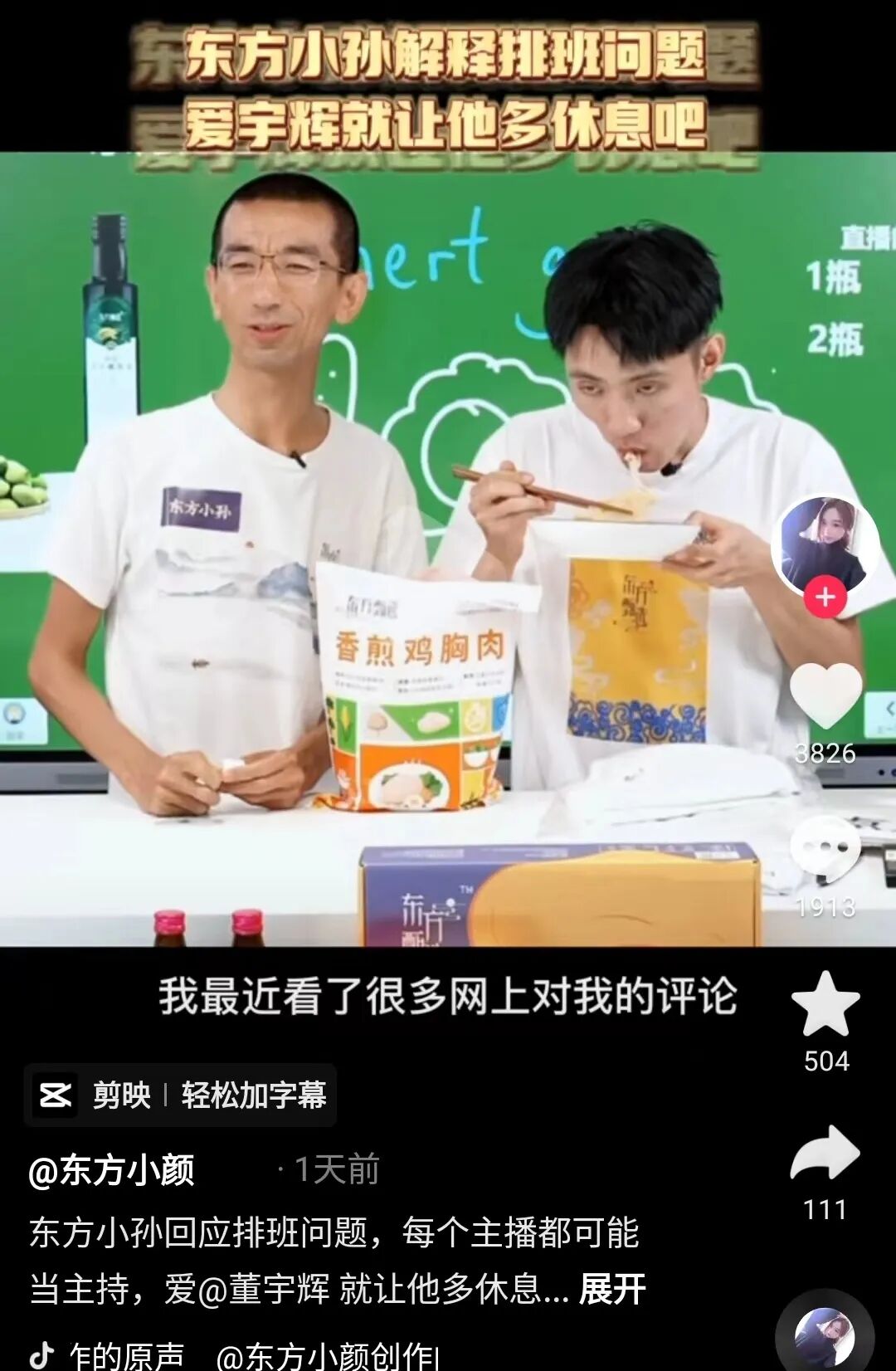 相较于前几次陈行甲、岳南、陈佩斯等大咖到场,董宇辉优秀的主持与控场能力。这次的直播被指翻车翻的很彻底。不少网友质疑新东方“卸磨杀驴”——故意黄金时间换掉董宇辉。对于直播当天直播数据的下滑与遭遇的吐槽,不少网友认为,俞敏洪这样做不仅伤害了董宇辉,也伤害了顿顿。对于俞敏洪所说的“事先不知道”,也被很多网友质疑在甩锅。面对粉丝和网友们的质疑,东方甄选CEO“小孙”进行了回应,表示收到了大家的批评,其实就是想让宇辉多休息一下,因为接下来俞老师会邀请更多的大咖来到直播间,不能只靠董宇辉一个主持。值得一提的是,昨晚董宇辉在直播中的回应再次令许多人动容。他直言当天确实有预告,并非临时换班。在替俞敏洪解释之后,更直言东方“小孙”是自己人生的伯乐,还说“春色满园才是春”。表示,不要因为爱去伤害,尽显大度和善良。