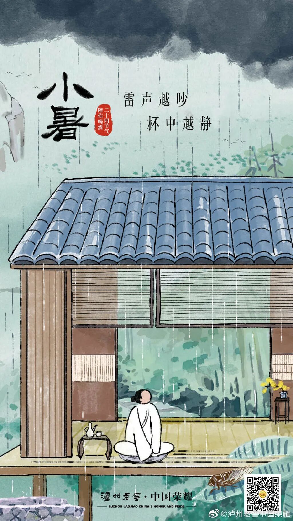 今日小暑。一声雷鸣,打破了持续的燥热天气,坐在屋檐下,喝着小酒,细听雷雨声。雷声越吵,杯中越静。