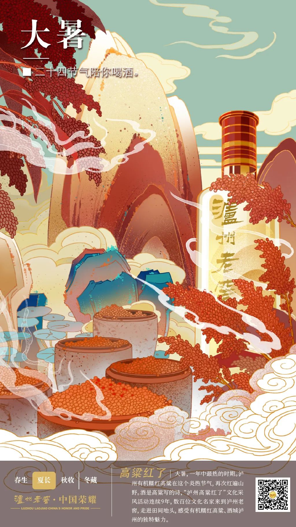今日#大暑# “对酒当歌,人生几何?”爱酒的诗人更懂生活的层次,在微醺的诗句中娓娓地表达着自己。酒是高粱写的诗,泸州高粱红了,田间的诗句等你来品味。