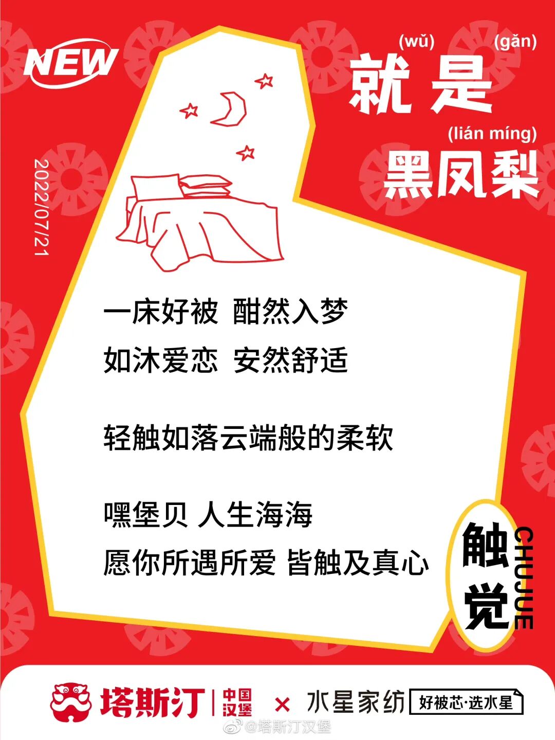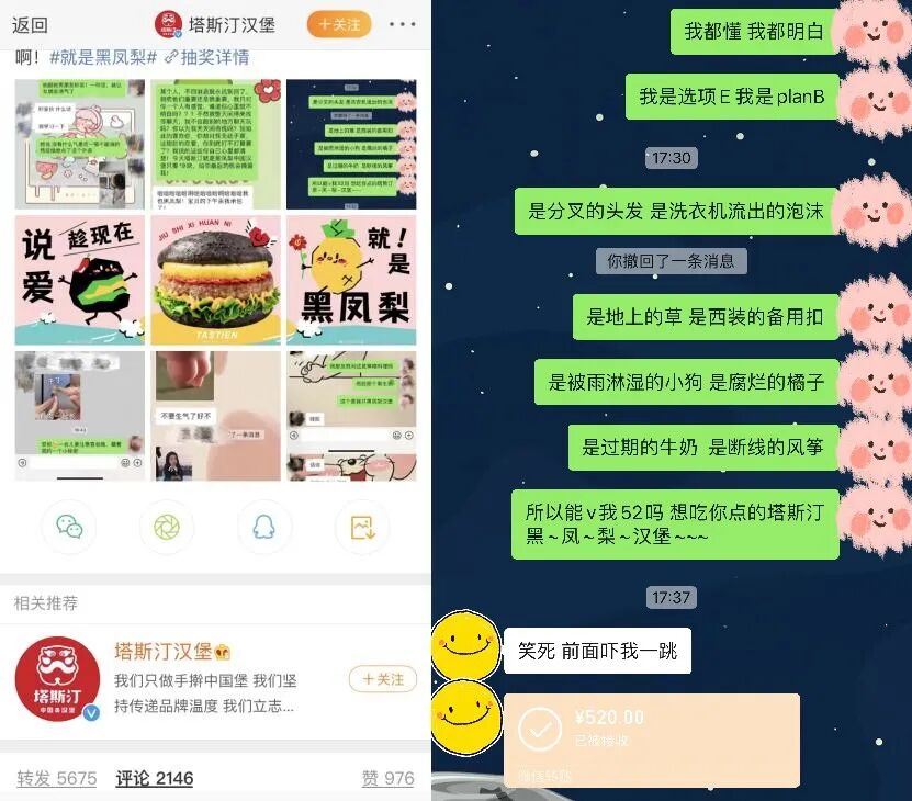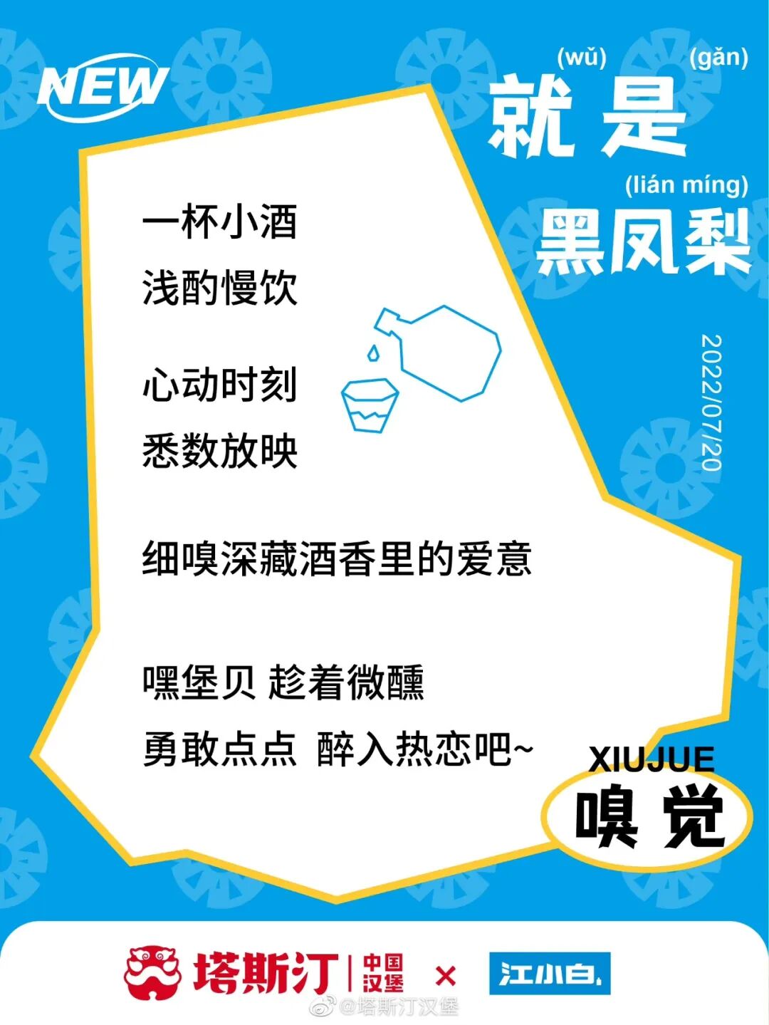 值得注意的是,在测试玩法引爆活动热度的同时,塔斯汀人气新品“黑凤梨汉堡”也被自然而然的精准顺势带出,潜移默化的成为测试结果里的七夕恋爱“幸运单品”和助攻神器。围绕谐音“喜欢你”,黑凤梨汉堡一上市就快速成为了年轻消费者手中的朋友圈新宠、表白神器,化身消费者在七夕佳节的表达窗口。