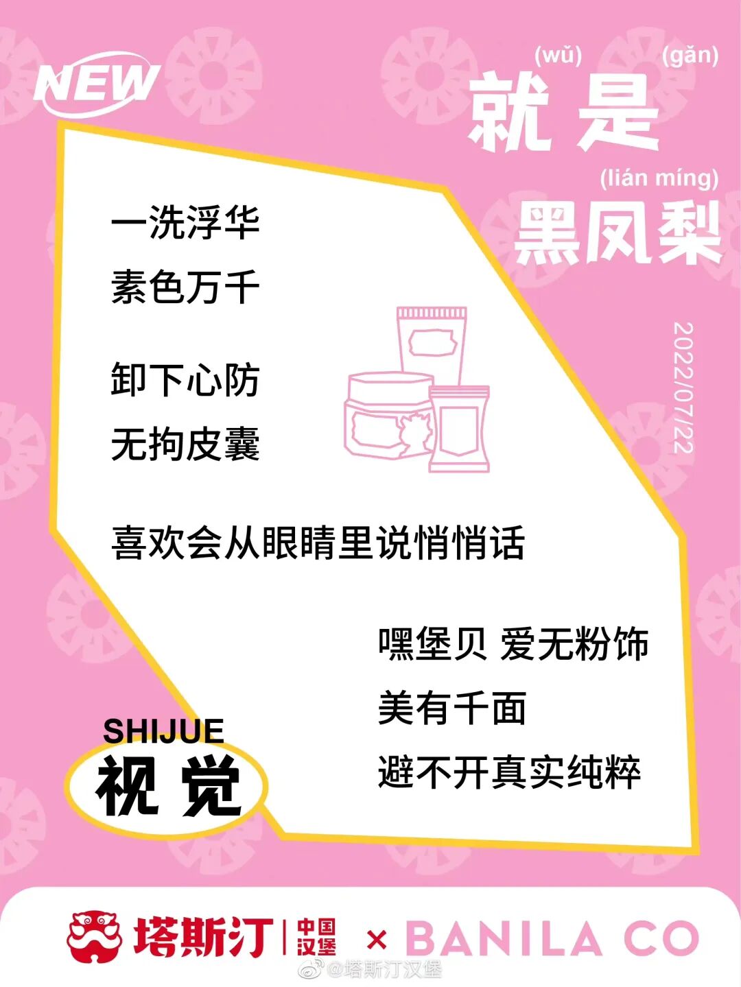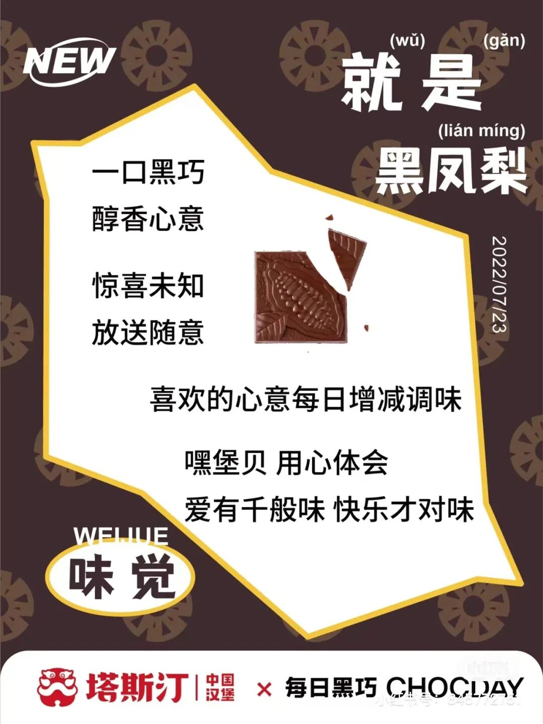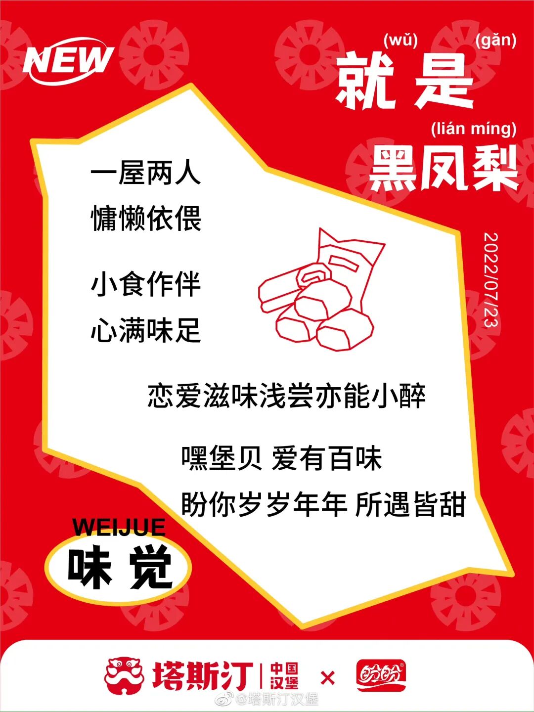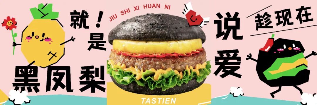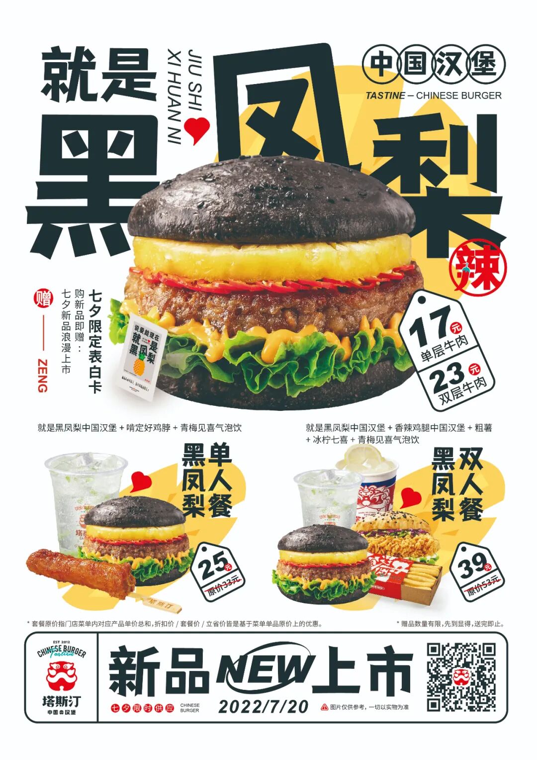在七夕节点竞争白热化的态势下,塔斯汀不仅以黑马之势掀起品牌话题传播热潮,同时在产品上也紧跟消费趋势与时俱进,从其七夕期间上线的夏日新品“就是黑凤梨”中国汉堡便可见一斑。黑凤梨汉堡包含了超丰盛的「四重味型」内馅,大口咬下酸、甜、辣、咸一触即发,摒弃“苦味”元素,尽情享受爱情的多样美好滋味,整体既熟悉又新鲜的碰撞体验在味觉边界不断试探,加上别具一格的“黑色”墨鱼汁堡胚”,让“黑凤梨汉堡”超越了简单的汉堡身份,成为这个夏天描述爱情的代名词。