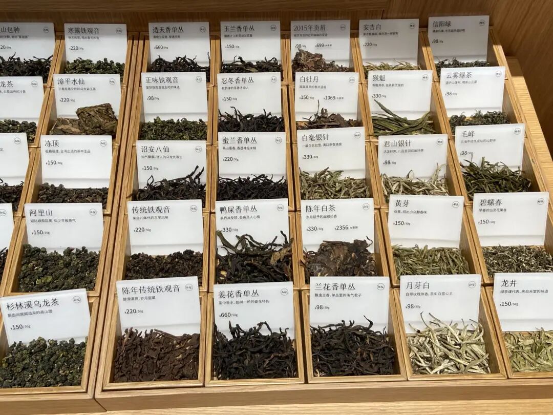 但你以为这就是「tea'stone」的消费天花板了吗?太天真了。在零售区,散茶的价格最低为百元,而最高则可至 600+ 元。像碧螺春、毛峰、龙井等比较常见的茶叶品类为 100-150 元/ 50g ,而姜花香单丛这样的珍贵名枞售价则达到 660 元/50g 。