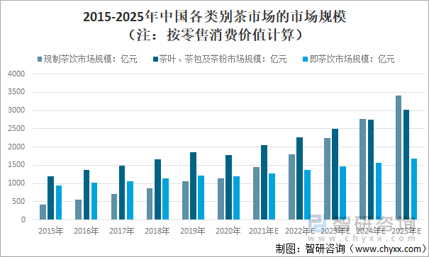 有需求自然就有市场。智研咨询数据显示,2022 年「现制茶饮」和「茶叶、茶包、茶粉」的市场规模将分别达到 1803.62 亿元和 2266.78 亿元,到了 2025 年又将分别上升至 3402.84 亿元和 3022.05 亿元。