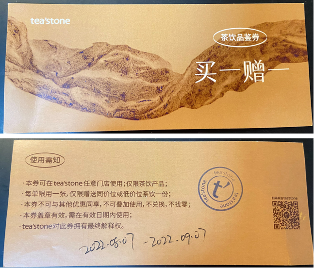 当运营社编辑部同事在喝茶时,有一位服务员过来询问用茶体验和感受、对产品有什么不满或意见,随后赠送了一张“买一送一优惠券”,可在下次消费时使用。