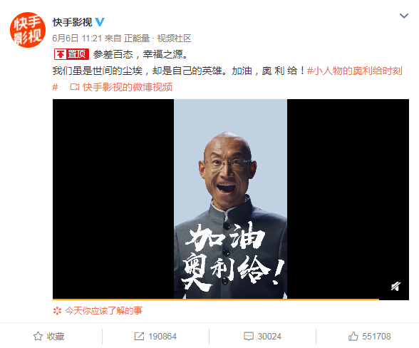 更有意思的是,《看见》的主讲人“奥利给”大叔黄春生成名于B站,但起家却是在快手。以“看见”为主题的《看见》将均带有浓重的快手印记的名台词“加油,奥利给”与“老铁,没毛病”进行了普世价值意义上的演绎与诠释。