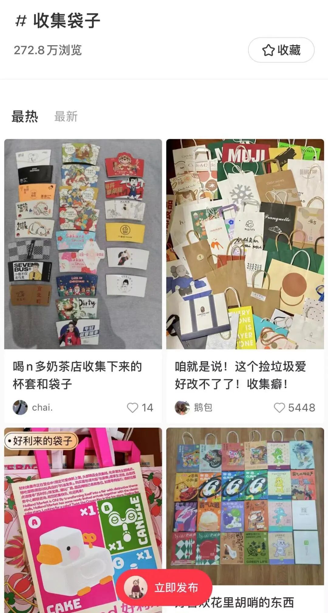 利用顾客“看在颜值的份上,我就……”的心理,这种好看、精美、极具创意的包装袋就在一定程度上刺激了人们的“购买欲”,甚至有“袋子收集癖”的人会会为了包装袋而去买奶茶,小红书上收集袋子的话题就有几百万浏览量。
