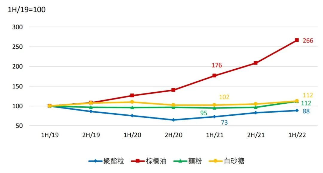 如果以2019年上半年为基点,至今年上半年,棕榈油价格上涨266%,面粉、白砂糖分别上涨112%,只有用于生产泡面袋及桶的聚酯粒有所下跌。
