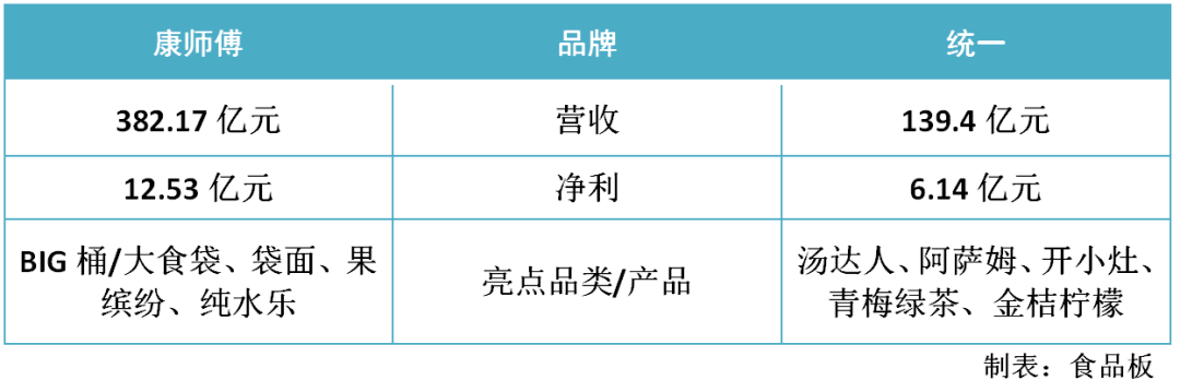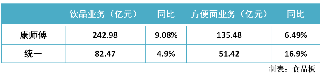 如今,康统双雄在品类上形成全方位对垒,两者的竞争充满着残酷。从上半年财报来看,康统的方便面板块、饮品板块实现双增。下面先来看一组数据: