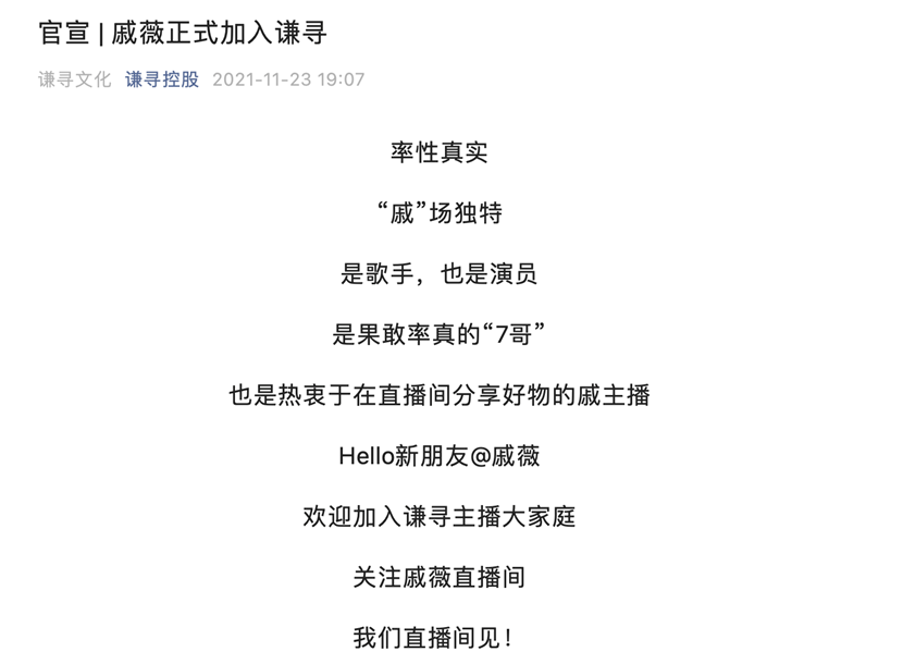 一年之后,戚薇又加入了谦寻控股。2021年11月,“谦寻控股”的公众号发布文章《官宣 | 戚薇正式加入谦寻》,文中介绍戚薇,“是歌手,也是演员……也是热衷于在直播间分享好物的戚主播。”