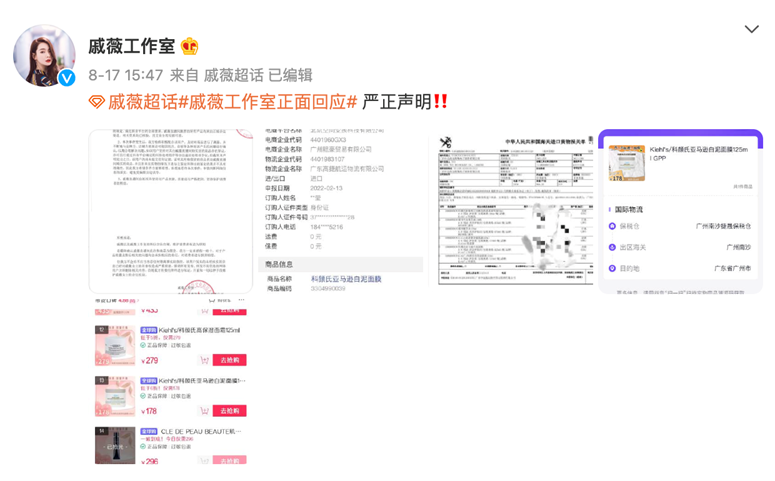 在陷入售卖假货疑云之后,8月17日,戚薇工作室在微博发表了声明,称直播间在商品推荐、销售及售后过程都满足抖音平台的全部要求,并承诺若是假货会假一赔十。