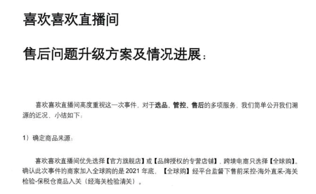 戚薇还在当天公布了售后问题及进展,澄清信息中显示,喜欢喜欢直播间优先选择“官方旗舰店”或者“品牌授权的专营店铺”,跨境电商只选择“全球购”,而此次事件的商家加入全球购的是2021年底,并表示,全球购经过平台监督下售前到保税仓商品入关。