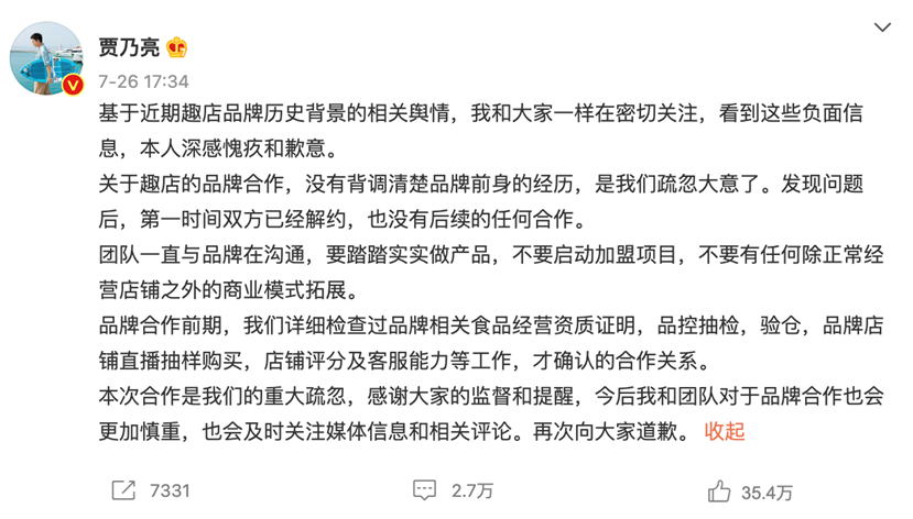 而就在一个月前,贾乃亮也遭遇了直播带货翻车。7月26日,和趣店老板罗敏在抖音直播间直播带货的贾乃亮被骂上了热搜,随着罗敏校园贷鼻祖的黑历史被曝光,顶不住舆论压力的贾乃亮开始和罗敏划清界限,向网友表示道歉,是自己的一时疏忽,没注意调查趣店背景,已解约。