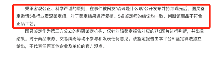 就在当晚,微博认证为AI全鉴定平台的@图灵鉴定-包小鉴在微博公布了鉴定完整声明,说明了事件经过、鉴定原理及资质和责成声明。在声明中显示,针对鉴定报告对应的7张图片进行判断,图灵AI鉴定小程序给出了“不符合正品工艺”的图片鉴别结论。在此基础上,图灵鉴定又邀请了5名行业资深鉴定师,对于鉴定结果进行复核。5名鉴定师的结论均一致,判断该商品不符合正品工艺。