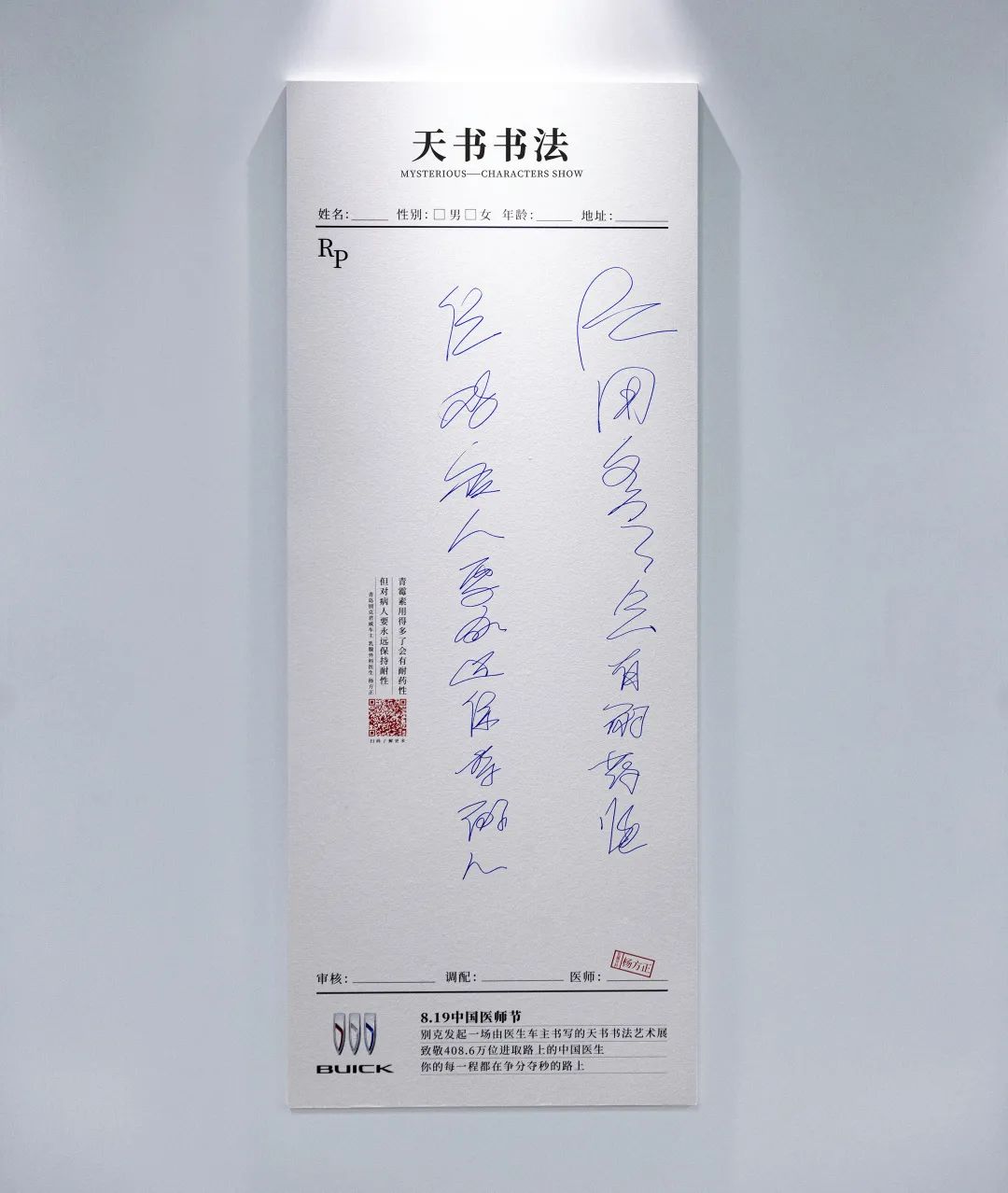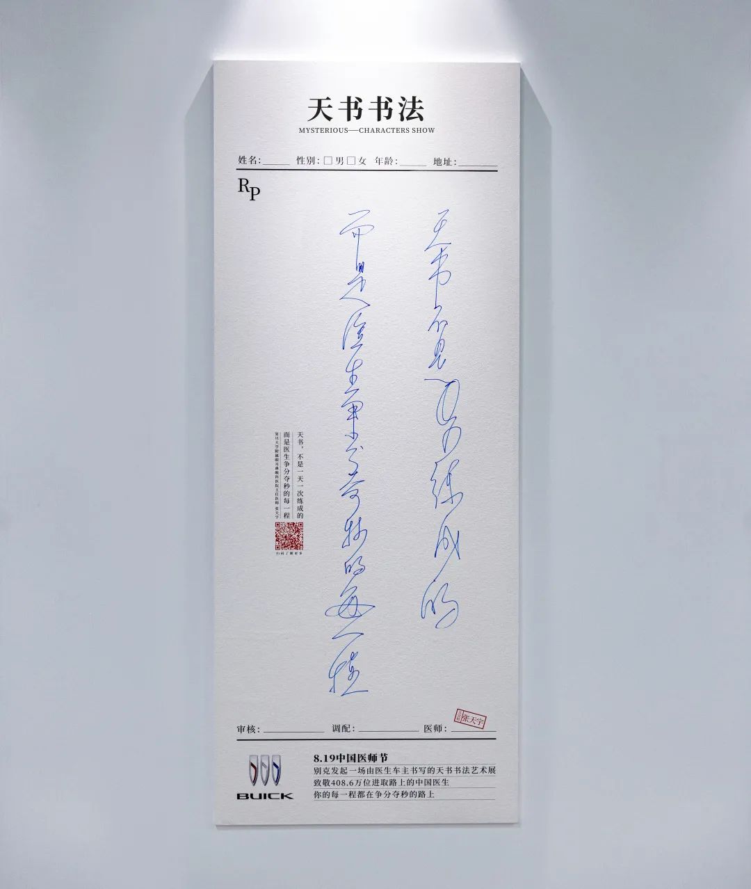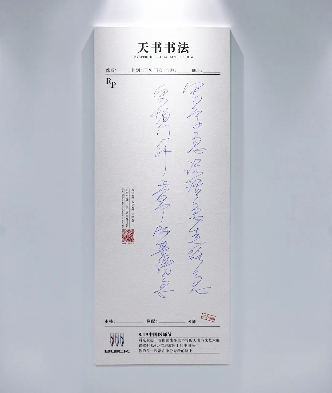 天书书法展,借别克医生车主之手,通过“天书”书法这种既特别又和医生强相关的形式,让医生的忙碌日常变成一幅幅公共艺术作品,被更多人看到。