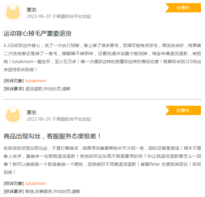 况且随着规模的不断扩大,供应链上的问题也日益显现。有越来越多的消费者开始吐槽lululemon产品的质量问题,在黑猫投诉平台上关于产品掉毛严重、起球开线等屡有出现。
