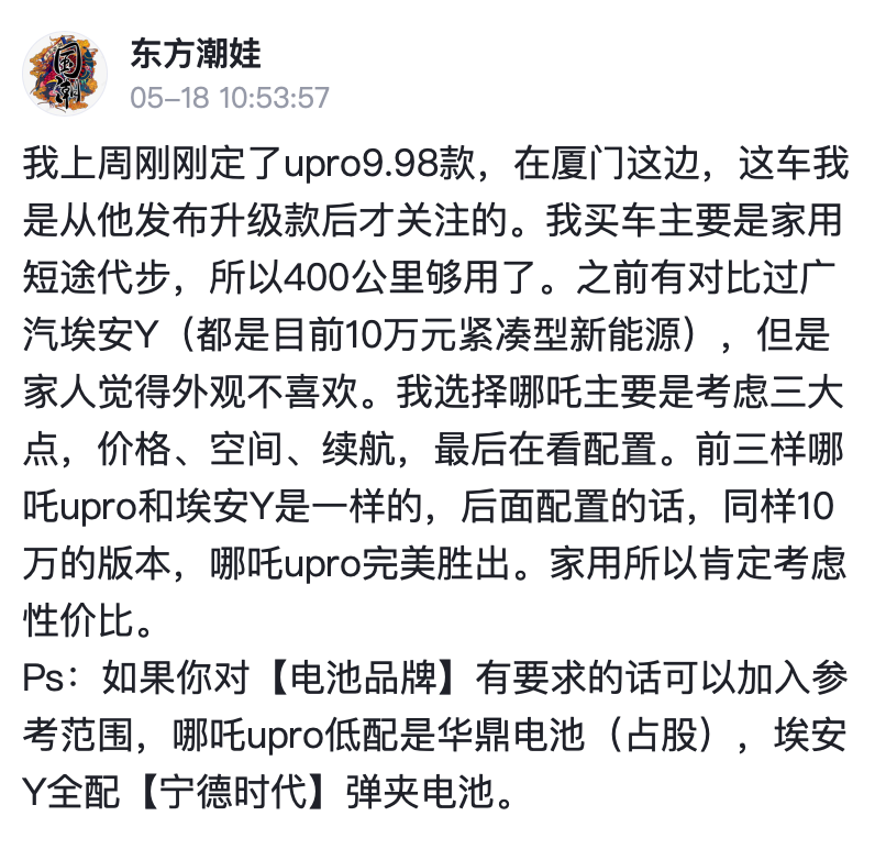 然而,当我们想到哪吒的时候,似乎除了性价比很难想到其他的故事。多数车友在分享自己购买哪吒的理由的时候,也常常以“这个预算内,空间最大的车”“这个价位最不像‘老头乐’的车”...这样的句式开头。