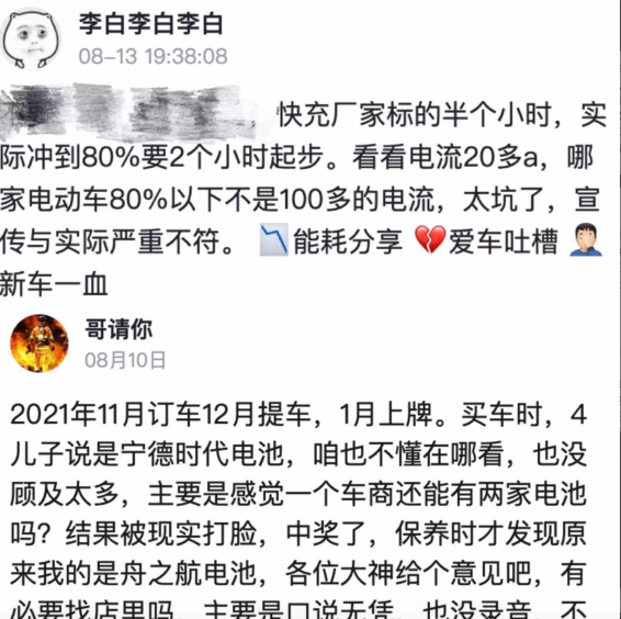 懂车帝的车友圈中就有不少车主对哪吒V和哪吒U质量的讨论。网名为“李白李白李白”的车友就表示,即使快充厂家标注充电只需要半个小时,但实际上想要充满80%都是两个小时起步。网名为“哥请你”的车友则表示,买车时被告知自己的电池是宁的时代,但是保养的时候发现电池是舟之航的。车友圈中还不停有车友更新自己的车遇到的大大小小的问题,防震不够好、系统黑屏、硬件时灵时不灵,等等...