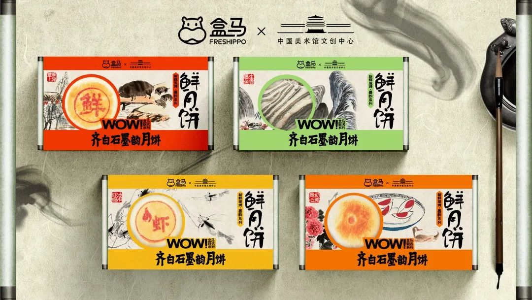 不只是新茶饮品牌,在零售市场上盒马鲜生也按耐不住月饼赛道的吸引,联合中国美术馆文创中心推出了齐白石墨玉月饼。把齐白石的知名画作和月饼进行完美融合,一度刷屏年轻人的朋友圈。