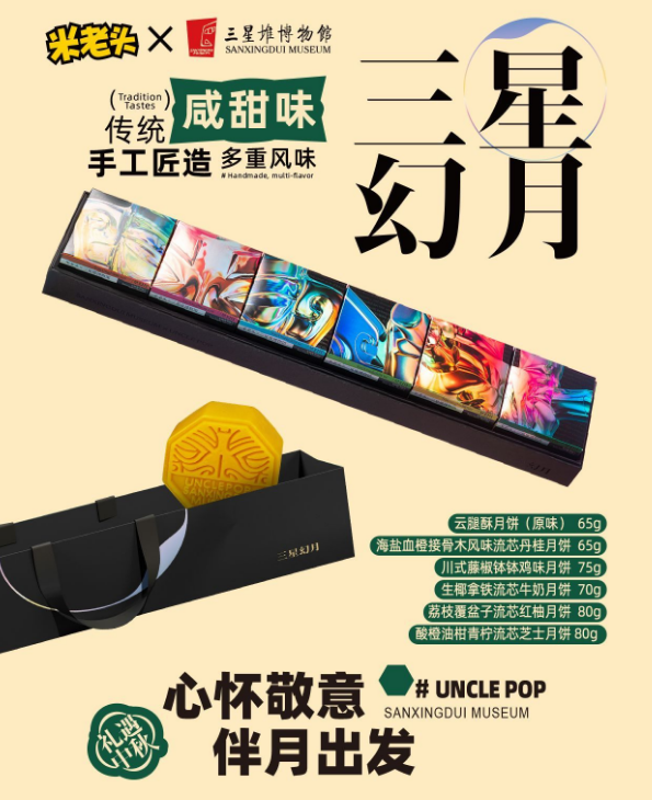 百事可乐联合胡氏糕饼世家推出了一款全新的“可乐月饼”;五菱宏光则官宣和五芳斋进行中秋跨界合作,推出“逐光中秋月饼礼盒”;米老头则是和三星堆博物馆进行联动,推出“三星幻月”。