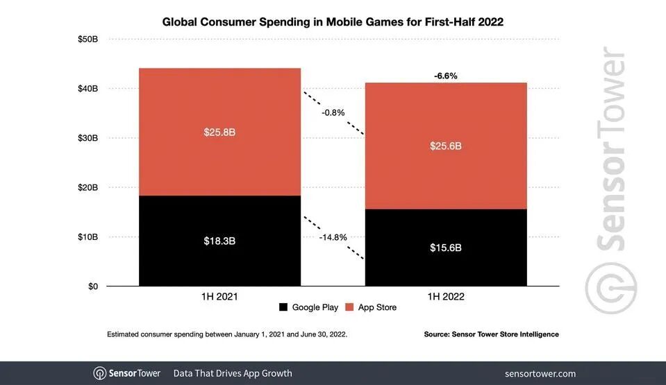 以针对移动游戏的统计和预测为例,据数据分析机构Sensor Tower统计,2022年上半年全球手游收入412亿美元,同比下降6.6%。而数据分析机构Newzoo则推测,2022年,全球手游收入预计将达到1035亿美元,同比上升5.1%。