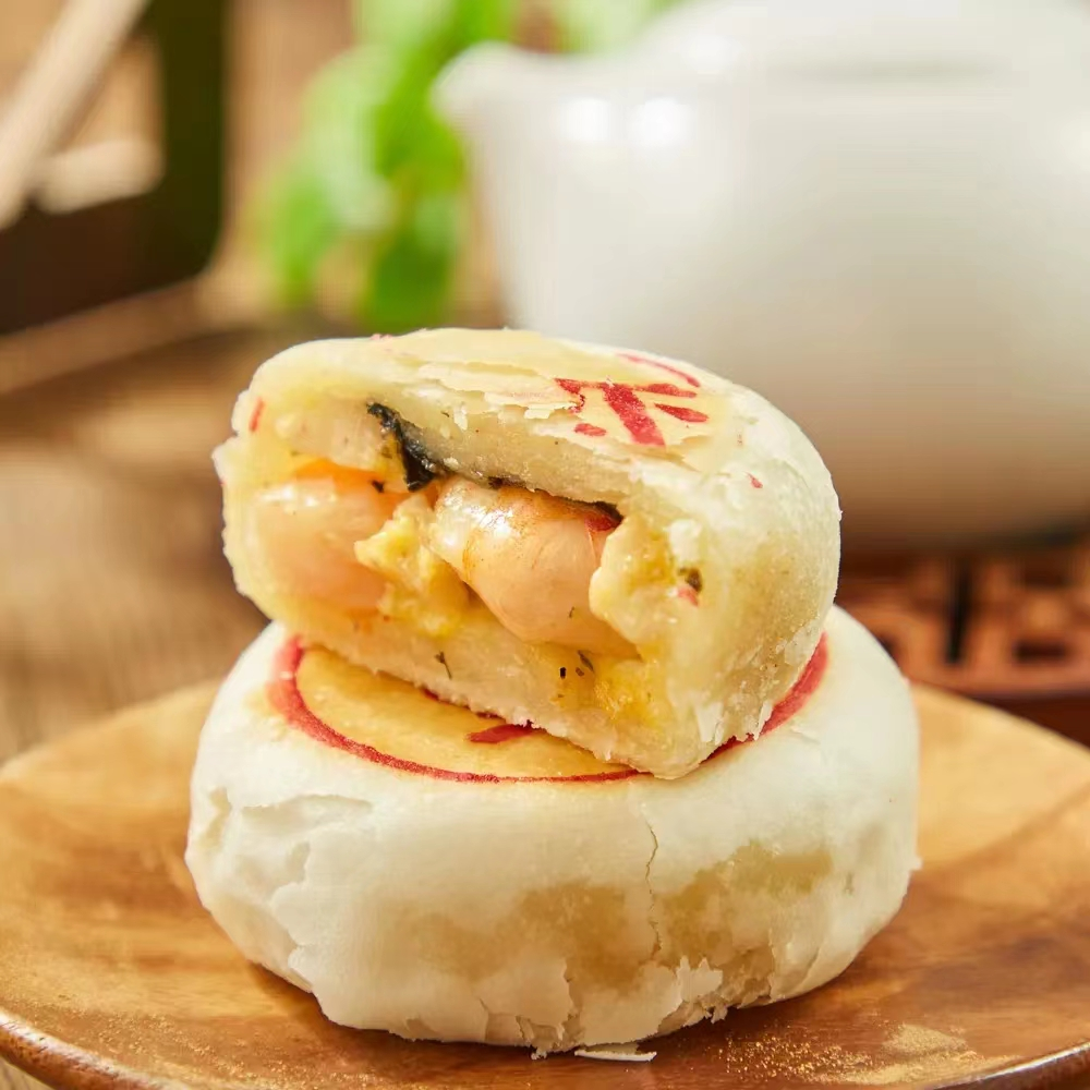 盒马芥末虾月饼灵感来源于齐白石名画《群虾》,在口味选择上,用芥末搭配大虾,每个月饼中都有一整只南美白对虾,虾肉的鲜甜和芥末的辛辣能够很好的中和,还能给消费者一口吃到一整只虾的满足感。