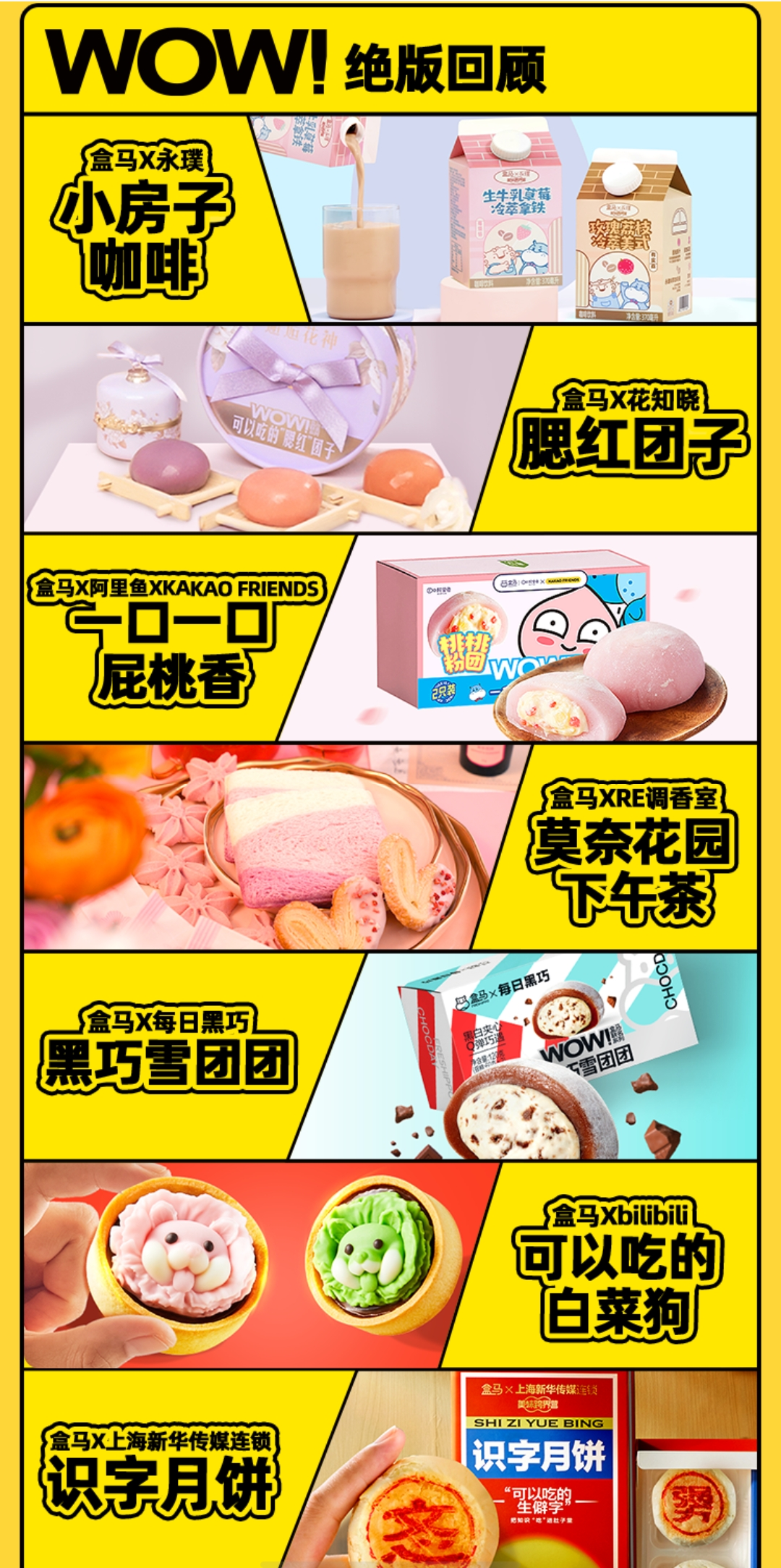 此外,盒马也持续深耕自营品牌,盒马WOW!跨界商品系列从去年开始打造。主打「年轻有活力,懂吃懂生活」,除了和新锐消费品牌及创意IP合作外,也会与传统IP做跨界营销。之前年货节,盒马联合菜狗IP和bilibili会员购一起做了新年限定礼盒,包含首款「可以吃的白菜狗」与限定款「盒马蓝菜狗手办」深受Z世代喜爱 。此外还和永璞打造小房子咖啡,抓住了年轻女生的少女心。盒马wow!系列每一次的联动,都凭借对消费者的深刻洞察,以创意出圈。