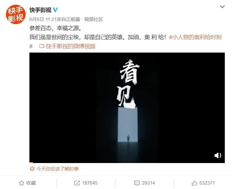 在“得粉丝者得天下”的流量IP时代,快手主播奥利给大叔在品牌权威背书的加持之下,触发年轻圈层集体共鸣引起众人感动。就像在《看见》视频中的他认真的喊着“加油,奥利给”,大家仿佛能隔着屏幕真实的感受到,“平凡人生活的精彩也值得被看见”。