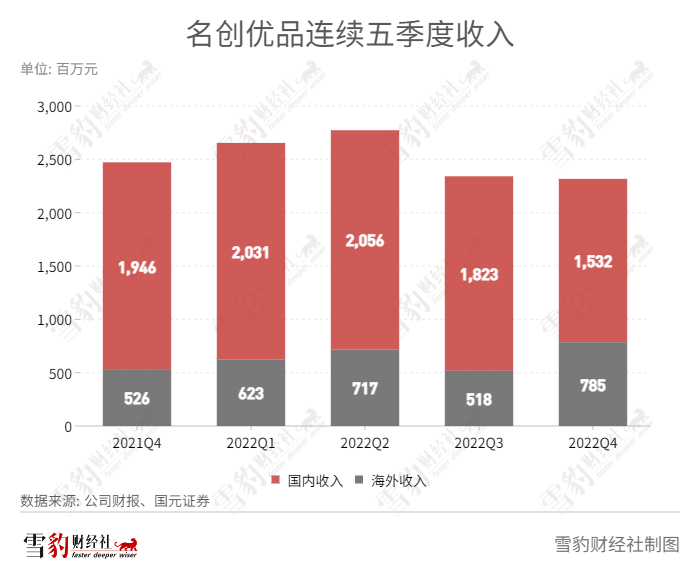第四财季,名创优品国际业务收入同比增长2.59亿元,国内业务收入同比减少4.14亿元,是国际业务收入增长金额的1.6倍。这意味着,国际业务的增长还远远赶不上国内业务对整体营收的拖累。