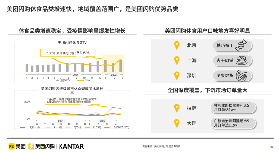 疫情居家或隔离,反而扩大了休闲食品的需求,用户在即时零售渠道线上下单,线下外卖送货上门习惯进一步形成。受此影响,2022年第一季度美团闪购的休闲食品同比增长54.6%。其中,3月份在上海这样的超一线城市,休闲食品增长接近200%。下沉市场订单量也在加大,比如西藏的拉萨林郭北路松鼠便利店,5月份订单量超过1万。