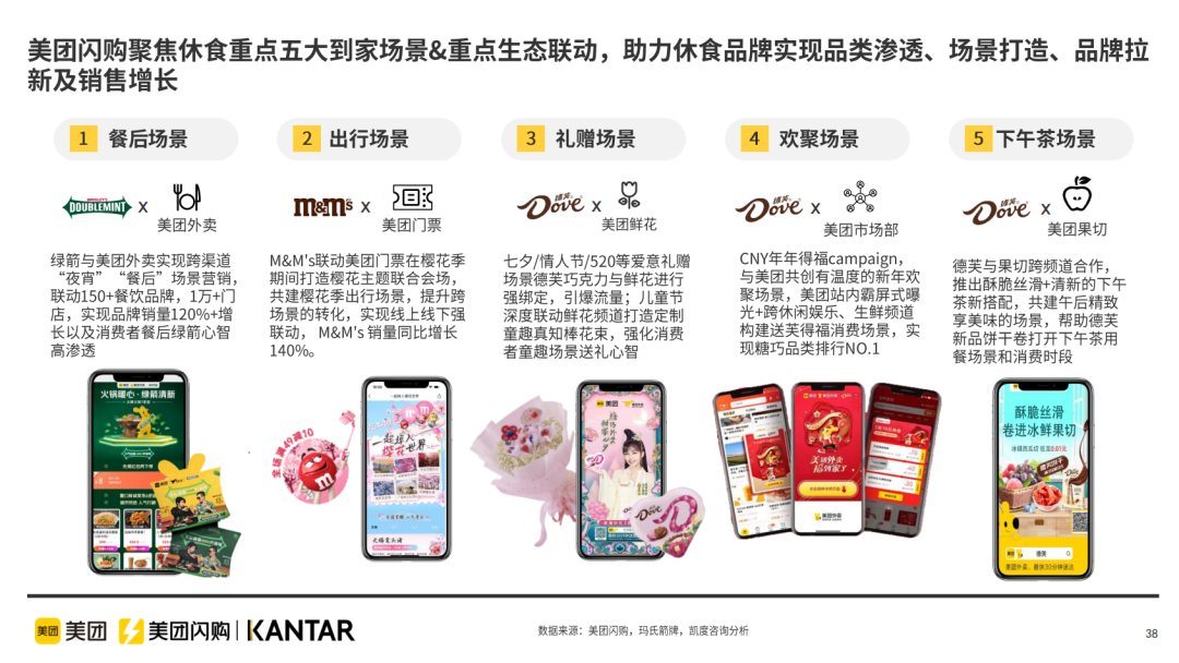 Step 1品牌力打爆:围绕聚会、夜间、礼赠、出行、午后焕活“五大场景”,与美团闪购共创“年轻用户与德芙的24小时”场景,然后根据每个时间点延伸消费者的需求,对应提供德芙产品解决方案。以下午茶为例,携新品“德芙卷卷”产品与美团果切品类进行合作,销售环比增长近 100%。。
