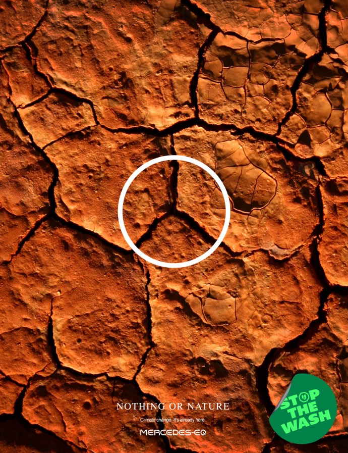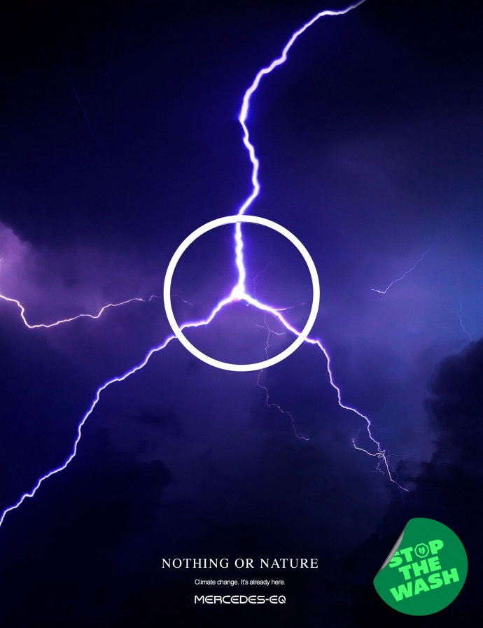 他们从燃烧的森林大火、浮在海洋上的石油、因干旱龟裂的土地、气候变暖碎裂的冰山当中,也找到了奔驰的logo。文案也从「Nature or Nothing」改为「Nothing or Nature」,语序的调整,带来语义的反转,用奔驰的文案向奔驰发起抗议。Climate change.It's alreaday here(气候变化,已然来临)最后还在右下角加了一个绿色标签「STOP THE WASH」可以理解为“停止洗绿”。wherefrom将两者的海报一一对应,唯一保留是闪电篇,该组织代表解释说——“闪电风暴的图片保持不变,是因为研究表明风暴的多发与气候变化也有相关性”。也有评论认为,这次的“反洗绿”不仅是针对奔驰广告,而是整个广告行业。一份欧盟报告指出,在各大品牌广告的“绿色声明”中,约有42%存在夸大和误导成分。其实把“生态环保”作为一种广告手段,并没有任何的问题。但是“把广告做好”的意思,不能是“广告一套,做一套”,而是要把对外的宣传,当做被监督的诺言。用文案向世界传递善意,更要把善意真的落地。
