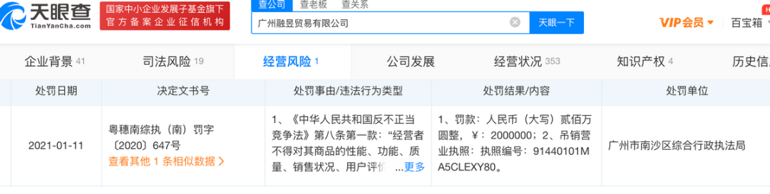 工商处罚信息显示,2021年4月29日,北京市小仙炖电子商务有限公司(“小仙炖”经营主体之一,下称小仙炖公司)因存在虚假宣传行为被处罚20万元并警告。