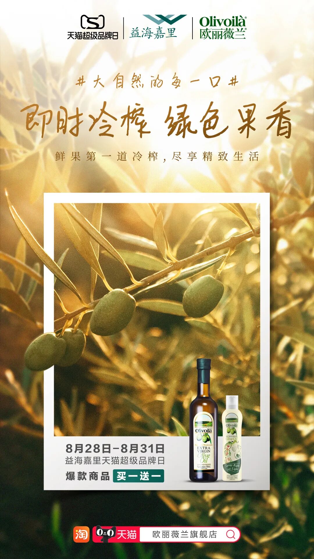 同时益海嘉里还持续加深消费者对于4大产品的自然品牌印记,将视频中的自然风光再次特写,用海报定格花生、橄榄、稻米原产地,聚焦原料的新鲜自然,强化谷维多稻米油、胡姬花花生油、稻谷鲜生有机现碾鲜米、欧丽薇兰橄榄油的自然属性以及带给消费者舒适的用餐体验。在视频+海报的视觉呈现之下,消费者对于4大产品的印象渐渐明晰,提高了品牌的自然联想度。左右滑动查看图片↑