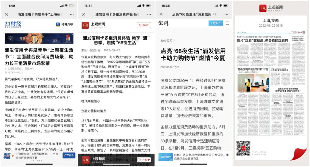 与此同时,浦发信用卡这场为“点亮夜生活”开展的品牌营销活动,还获得21财经、上观新闻、澎湃新闻、《解放日报》等多家主流媒体报道。除了媒体内容输出,浦发信用卡还持续借助本地头部生活号,辐射用户社交平台,为自身带来了流量与话题助推。以“节日”为话题,提升了“66生活”品牌IP的口碑与影响力。
