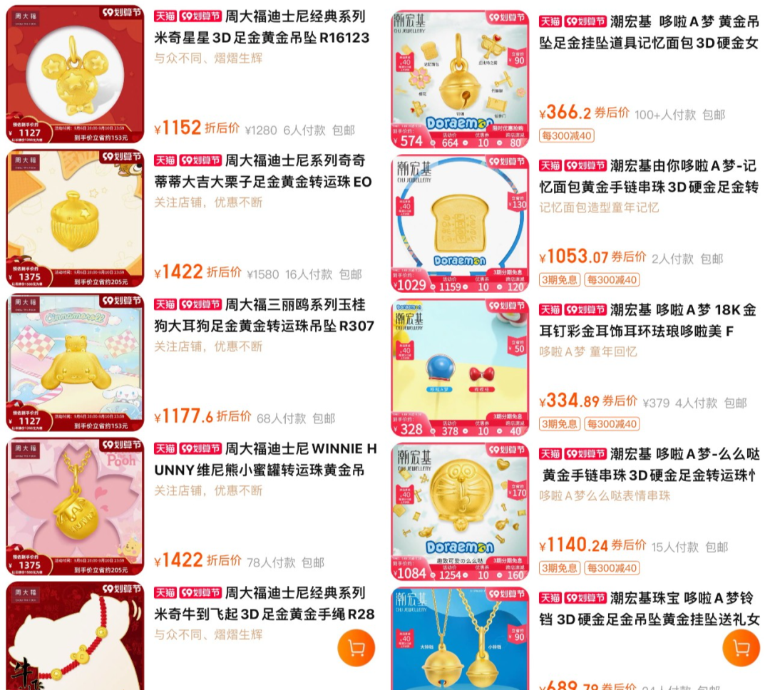 今年618期间,京东新百货开门红10分钟的时候,周生生、六福珠宝和潮宏基等品牌的成交额就达到了超过100%的增长。《2021中国黄金珠宝消费调查白皮书》统计称,在金店的消费人群中,25-35岁年龄段的已经占到了75.59%。于是,现在的黄金已经摆脱了过去土俗的形象,开始在设计上下功夫迎合年轻人的审美:米老鼠、哆啦A梦、兔斯基都有了正版授权的黄金饰品。它们通常都采用3D硬金或者5G黄金工艺,弥补了传统黄金因为质地软导致的造型局限问题。而且在同样的克重下,体积能做到传统产品的3倍,让年轻人有一种物超所值的感觉。周大福推出的针对年轻人的“传承”系列一度在小红书、抖音等平台刷屏。据统计,去年4月到9月期间,购买周大福“传承”系列的Z世代和千禧一代的消费者占比达到了56%。周大福这样的品牌金店的打法,是用过人的工艺和IP联名获得超额的黄金克重溢价。在周大福官方商城中,重量为0.59克的小版平安扣手链卖到了729.6元,克重单价达到了1236.6元/克;重量1.7克的三丽鸥My Melody系列美乐蒂单面爱心黄金吊坠折后价为2284.8元,克重单价1344元。而它在首页公布的工艺品黄金零售价则仅仅为483元/克。深圳水贝村的黄金珠宝占据了全国的半壁江山,这里的众多小商家采用了化整为零方。他们主打的小金豆克重轻,而且采用“实时金价+工费”的计价方式,单件售价不高,降低了年轻人入手的门槛。金豆成为了很多95后、00后消费者发薪日的最爱。对于小金豆的拥趸来说,每个月在领到工资之后买一颗金豆成了理想的存钱方式。深谙消费心理的商家往往会随单赠送一个空瓶,方便客户收集、存储金豆。收到货的年轻主顾在把心心念念的金豆放到玻璃瓶里以后,还能拍照发个朋友圈,真的是仪式感十足。在买金、收货以外的日子,Z世代们还可以时不时晃晃一瓶未满的储金罐子,听听那清脆的声音;或者把一颗颗金豆豆统统倒出来数一数,也很有减压效果。这些小金豆有的是买给女友的,准备攒够100个就求婚;有的是买给自己的,准备以这种方式攒一笔嫁妆。线上黄金生意就这样成了一款年轻人钟爱的养成游戏。又因为黄金的保值特点,这种“钱花了,又好像没花”的神奇体验吸引着曾因自己三分钟热度而悔恨剁手的千禧一代们。对于小商家来说,这种售卖方式的复购率很高。小金豆的利润率虽然远远不如大店的精美首饰,但胜在是标品。年轻人们买回去也不戴在身上,所以不存在像手镯等饰品配戴不合适要退货的售后风险。而且小金豆即使卖不完融掉,损失也不大。从去年的双十一到今年的618,年轻人中间刮起了一阵理性消费风。豆瓣的“不要买 | 消费主义逆行者”有超过30万用户,拒绝在消费上满足伪需求、踩雷或者交智商税。无论是培育钻石还是小金豆,既是科技带来的新选择,也是延迟满足与克制自律的快乐。在消费主义逐渐退潮的当下,专注贩卖概念的黄金珠宝也不得不继续进化。