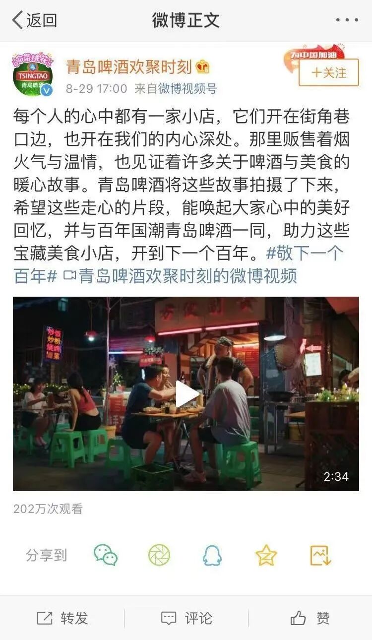 每个人的心中都有一家小店,它们开在街角巷口边,也开在我们的内心深处。8月29日,青岛啤酒官微发布《敬下一个百年》影片,借场景化、情感化语言俘获用户心智。