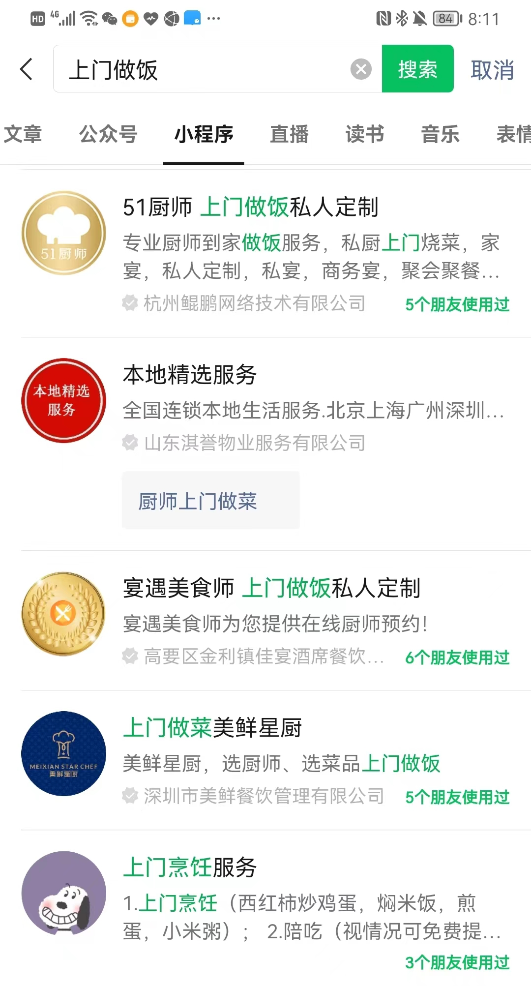 第二种是通过小程序下单,目前做的比较好的上门做饭小程序有51厨师、宴遇美食、美鲜星厨等,通过搜索发现有不少朋友都使用过这种服务。