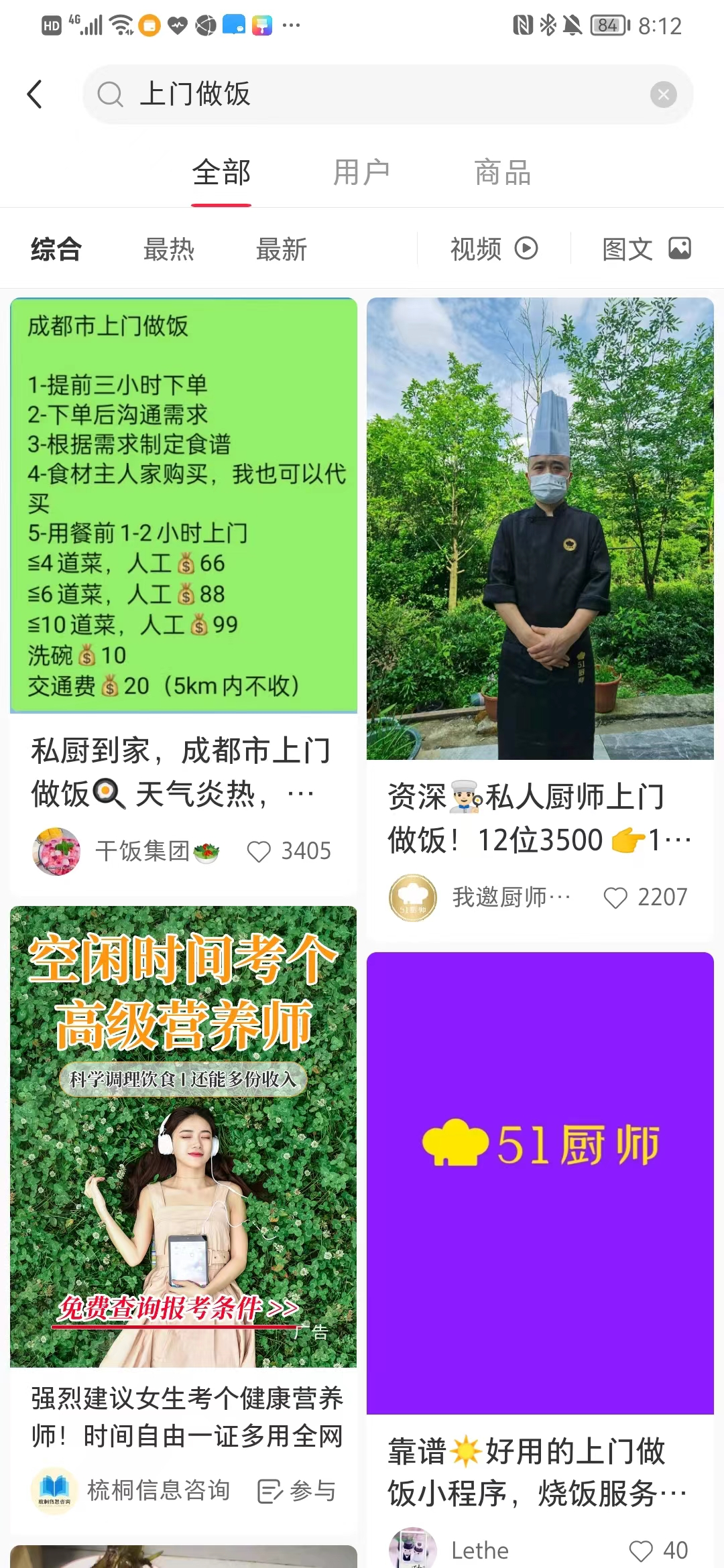 第三种是平台种草,在小红书上也有不少上门做饭的服务,与小程序上的大厨做饭不同的是,这里也有便宜的服务。
