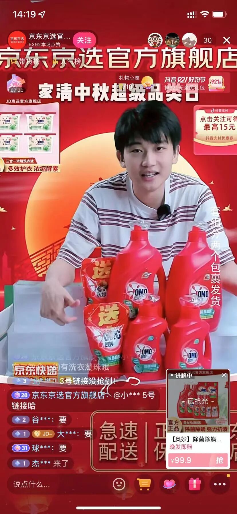 同时,在抖音侧,联合利华采用了自播+达播的组合拳,多元化带货模式,助力销量爆发。一方面,基于联合利华和京东的战略统一,在9.13活动爆发当日强强联手,京东超市、京东优选、京东家清、京东个护、京东快手、京东京选六大账号矩阵进行专场直播带货,有针对性地进行王牌好物推荐,精准触达细分用户。另一方面,邀请抖音当红达人潮爸刘教授进行了直播带货,借助其抖音达人的号召力,联合利华同样斩获了不俗销量。