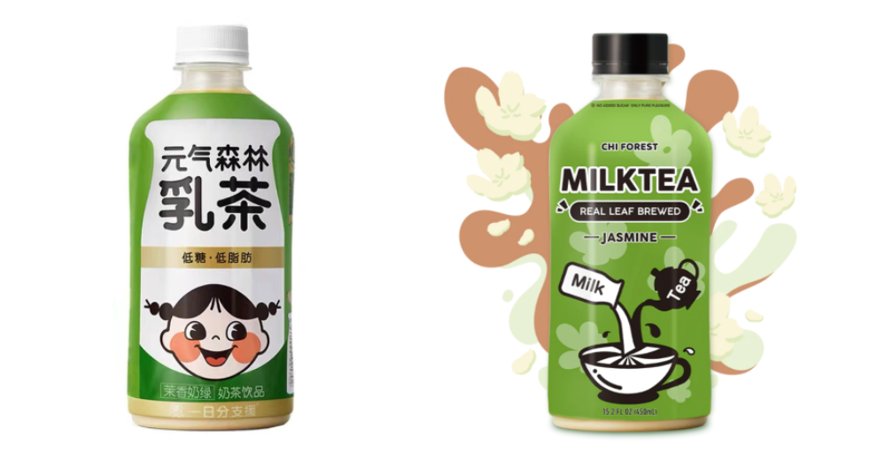而包装设计变化最大的,要数元气森林乳茶系列了。原本的包装是以一个卡通女孩的头像搭配“元气满满”和“乳茶”的文字排版设计。