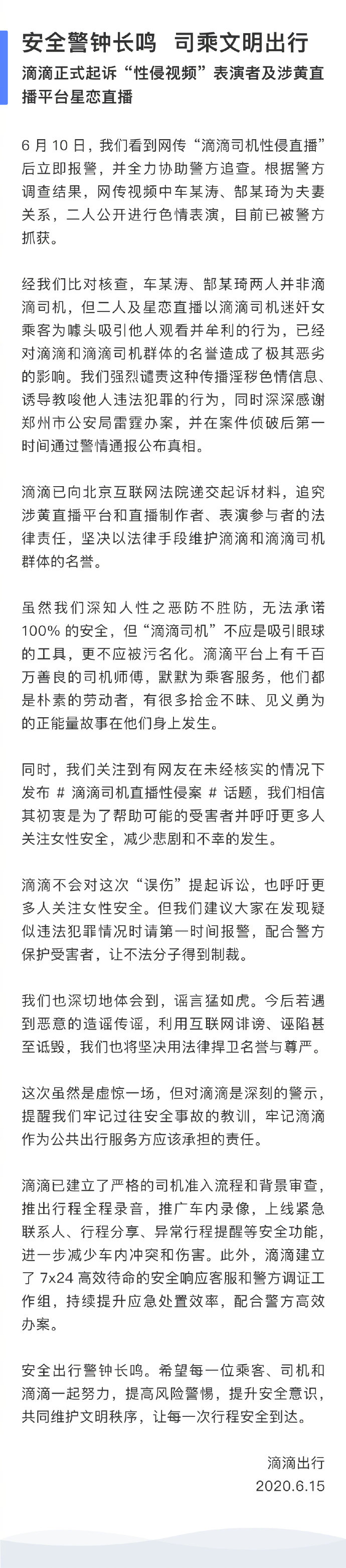 6月15日晚间,滴滴出行在官方微博发表声明,将正式起诉“性侵视频”表演者及涉黄直播平台星恋直播。声明称,滴滴已向北京互联网法院递交起诉材料,追究涉黄直播平台和直播制作者、表演参与者的法律责任,坚决以法律手段维护滴滴和滴滴司机群体的名誉。